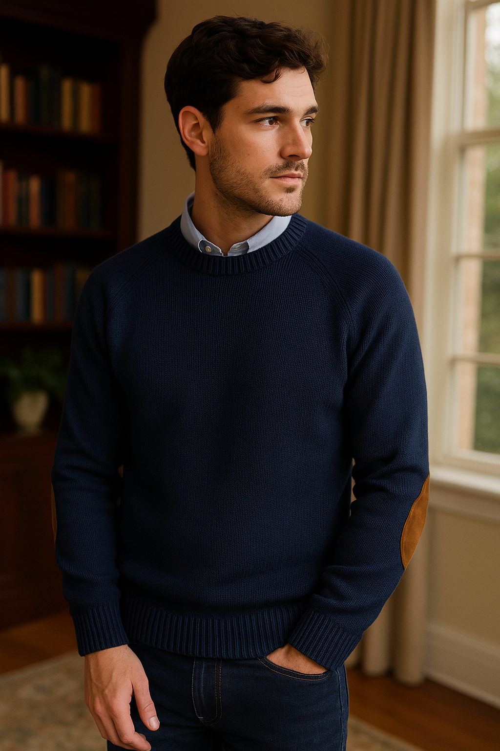 Camden™ Elbow Patch Sweater är en tröja där tidlös stil möter modern enkelhet. Den djupt marinblå stickade tröjan med armbågslappar i mocka är ett raffinerat basplagg som ger personlighet åt svalare väder. Oavsett om du är på väg till kaféet, campus eller landsbygden ger detta plagg komfort och charm.
