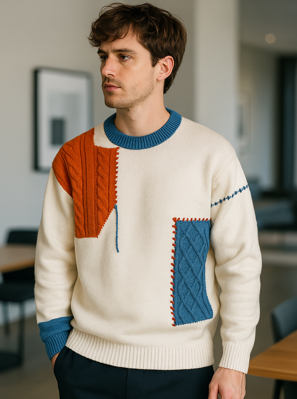 Milo™ Patch Knit Sweater ger din garderob ett stänk av kreativitet. Med djärva block i orange, blått och grädde, plus handsydda detaljer, handlar den här tröjan om personlighet och komfort. Det är ett unikt plagg som förvandlar mys till ett statement.