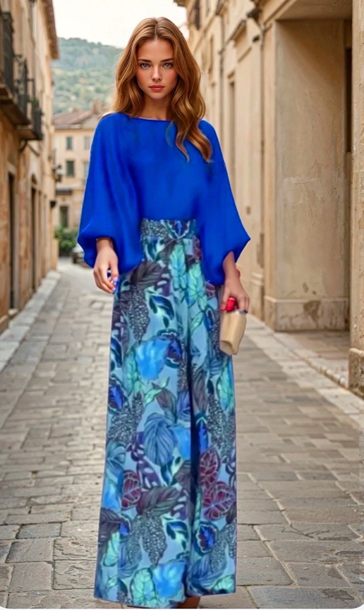 Zenova™ Zara | 2-delat set, chiffongskjorta i bomullssatin och elastiska byxor i Tropicana