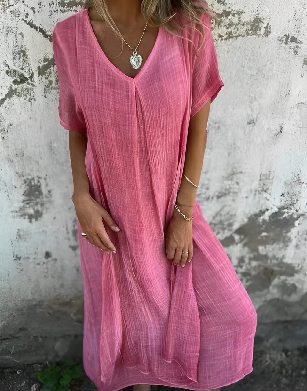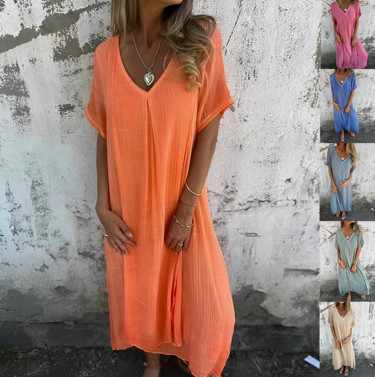 Denna bohemiska långklänning, med korta ärmar och V-ringning, är perfekt för varma dagar. Den är tillverkad i lättviktigt tyg som andas och ger dig komfort och stil i livfulla färger som korallorange och ljusblått.