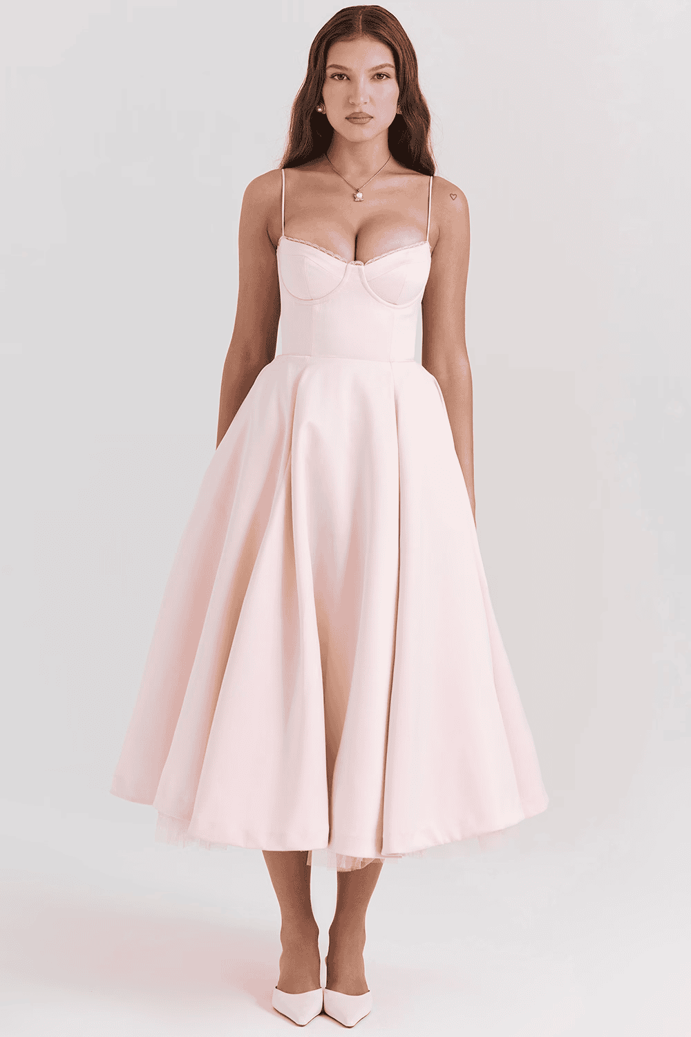 Tänk dig att glida in i vår populära Askungenklänning och känna dig som nattens stjärna. Denna exklusiva design är tillverkad i lyxig duchesse-satin och delikat powermesh och framhäver din figur samtidigt som den ger oöverträffad komfort. Den voluminösa midikjolen i tyll garanterar en oförglömlig och sofistikerad look.